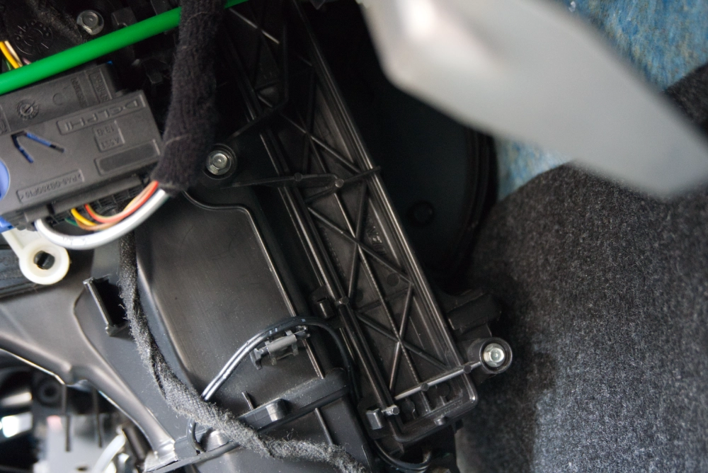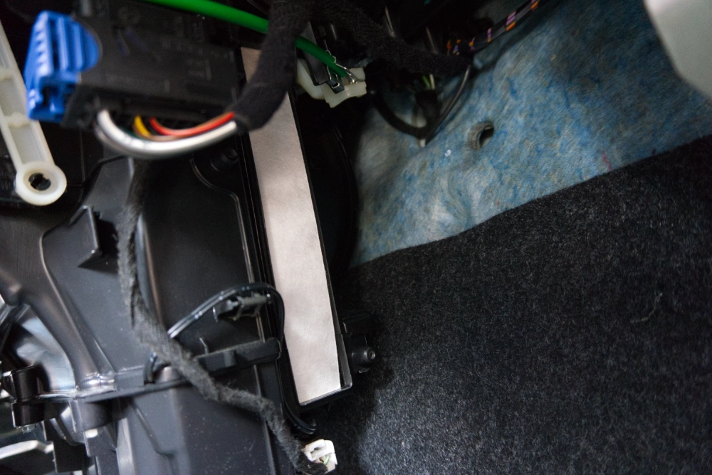 Aufgepasst: In Teppich des Beifahrerfußraums, direkt unterhalb des Innenraumfilters, befinden sich einige Löchern. Es ist keine Seltenheit, dass die Schraube genau dort hineinfällt. Dann ist der komplette Teppich auszubauen, um die Schraube wiederzubekommen. Deshalb ist es ratsam, die Fußmatte nach oben zu schieben oder die Öffnungen auf andere Weise abzudecken.