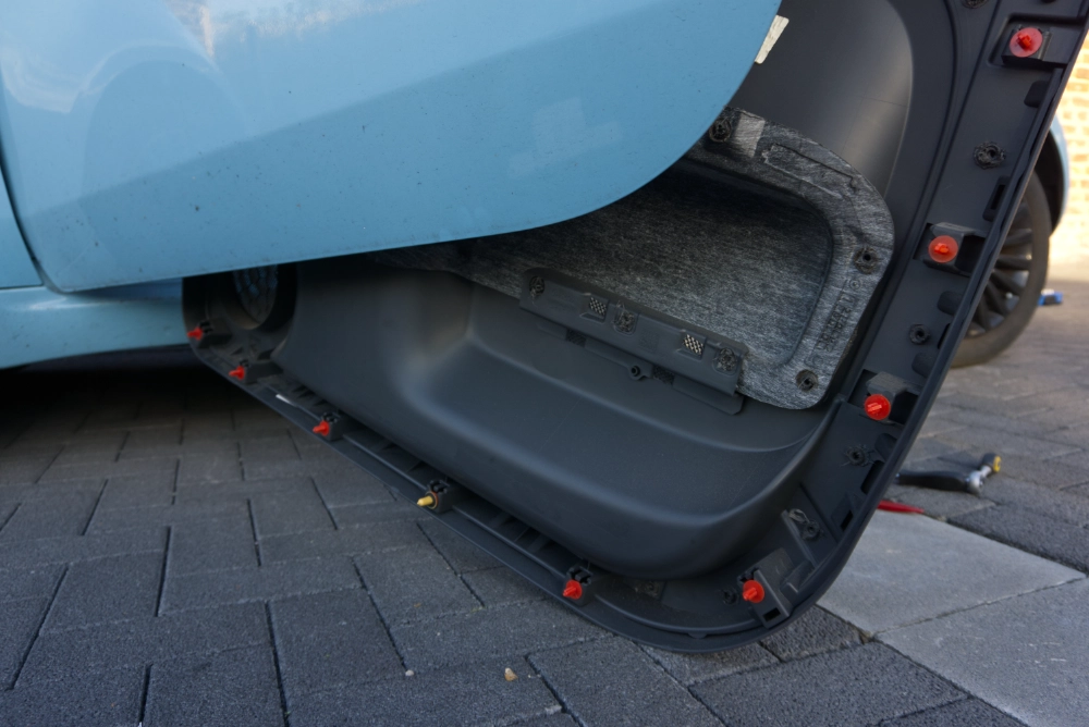 Sobald das Scharnier getauscht ist, lässt sich alles wieder in umgekehrter Reihenfolge zusammenbauen: Bei der Montage der Türverkleidung ist vor allem im Bereich der Fensterkante auf einen perfekten Sitz zu achten. Die Verkleidung muss von oben auf die Kante geschoben werden, bevor sie unten wieder eingeclipst wird. Anschließend alle drei Schrauben festziehen. Fertig.